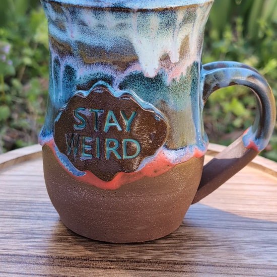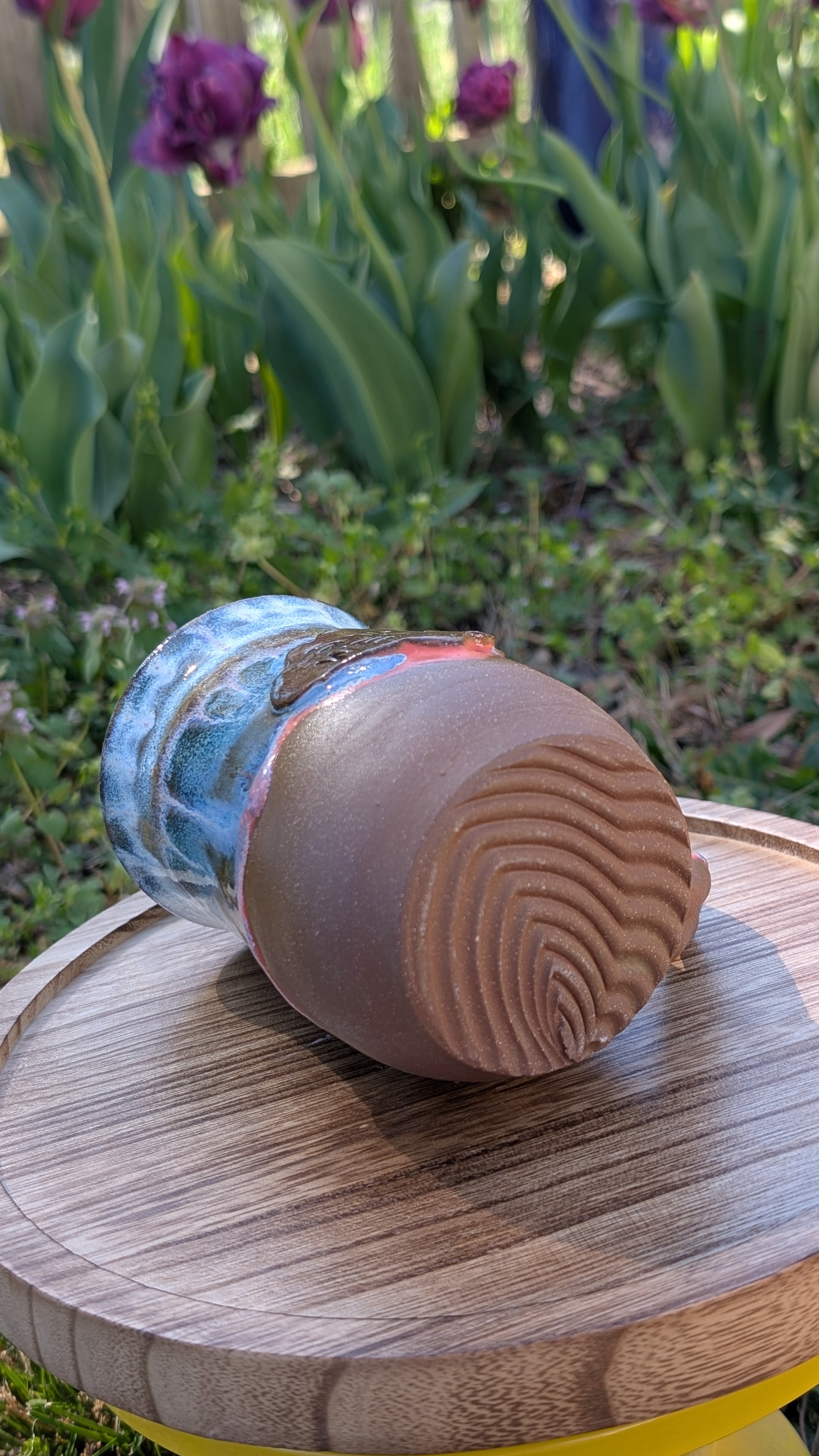 Wheelthrown, fired, glazed with food safe glazes, fired again.